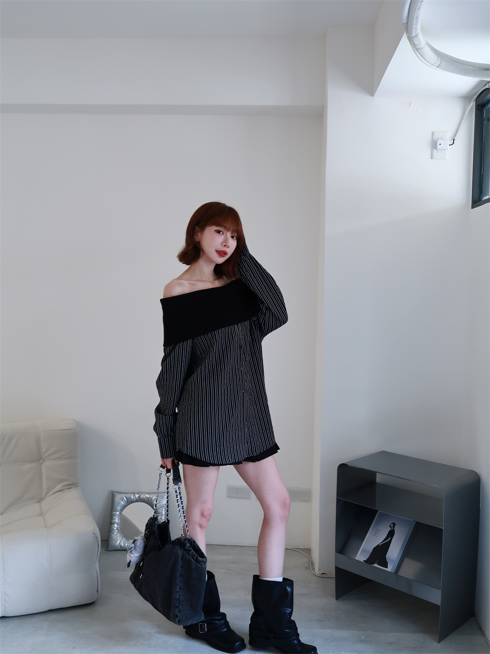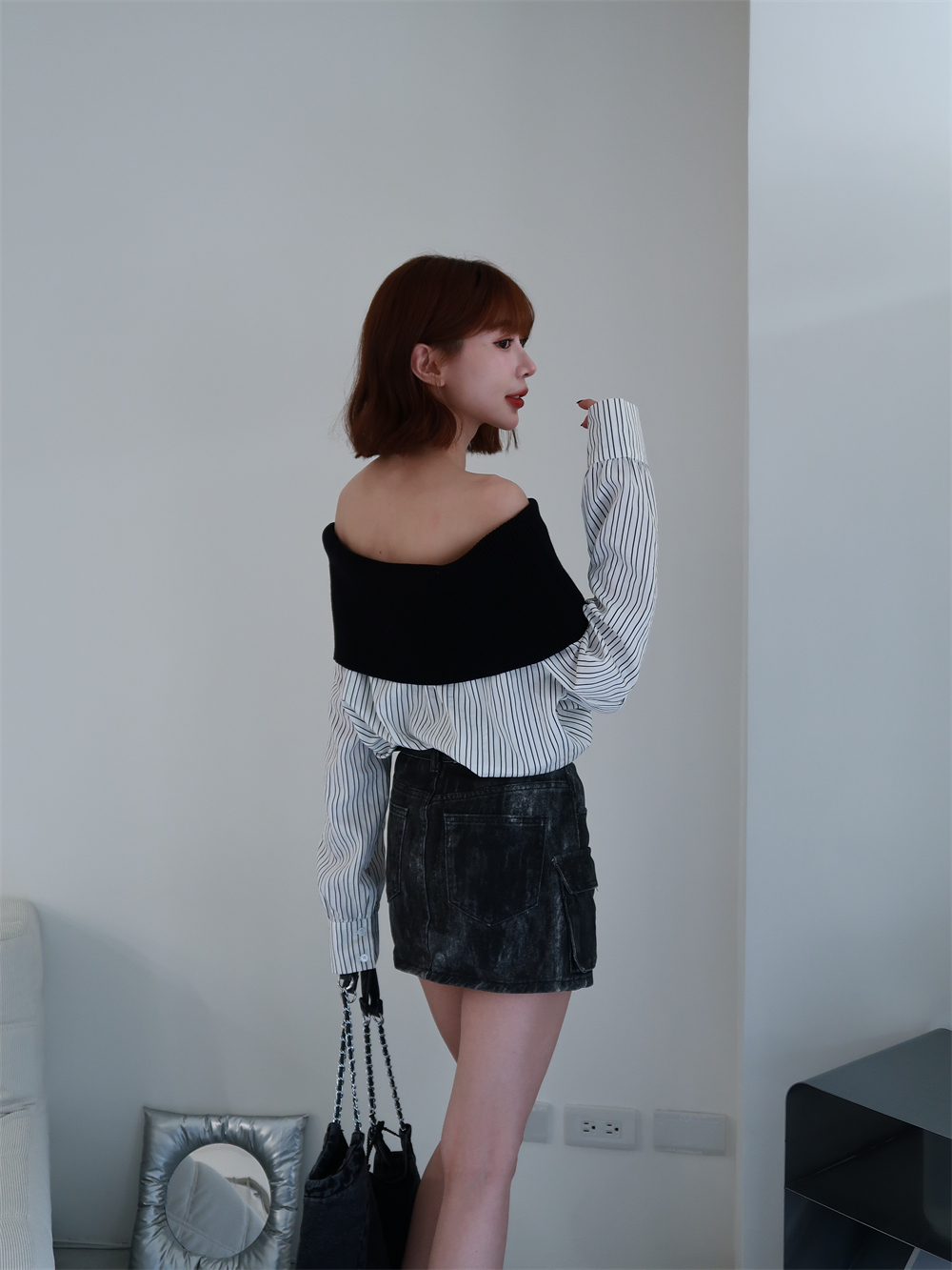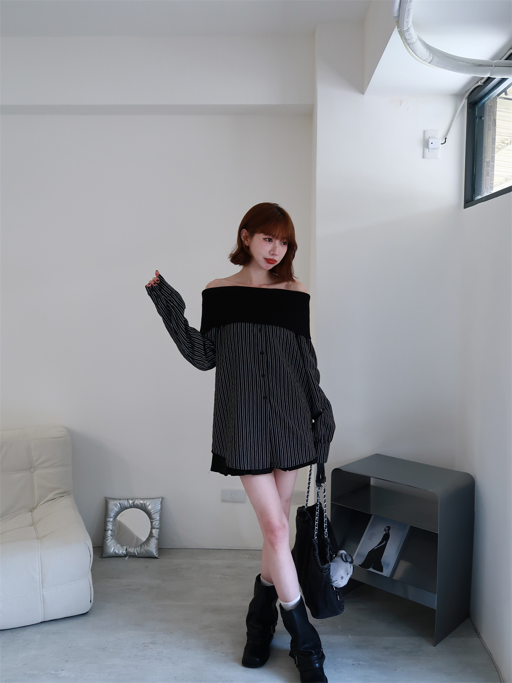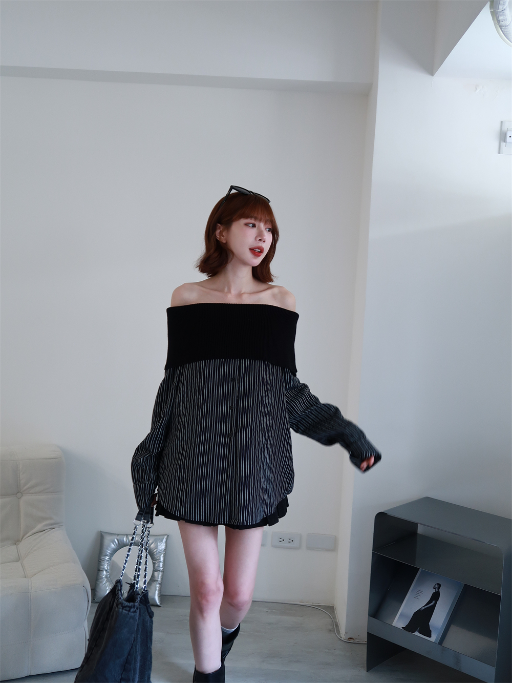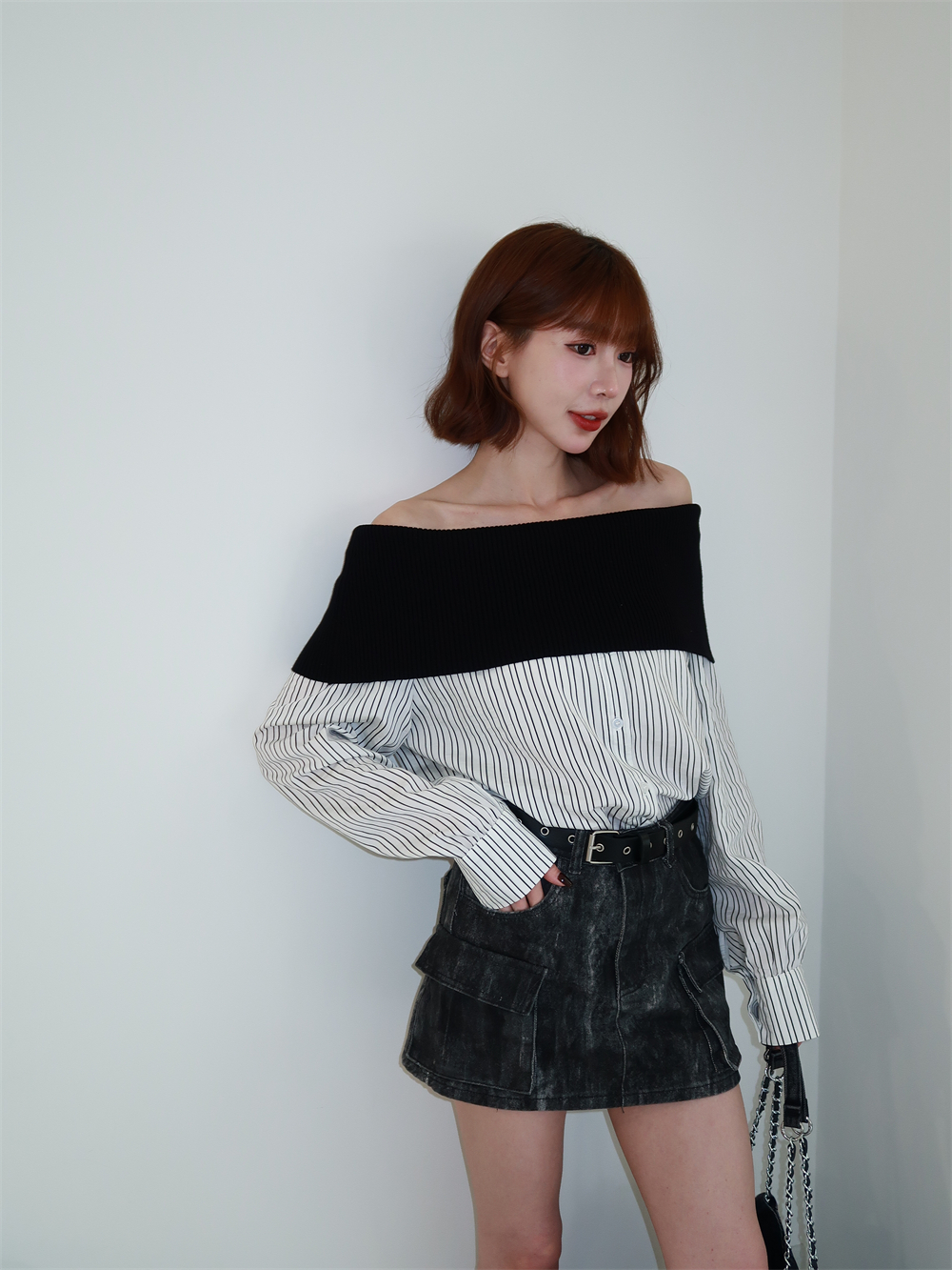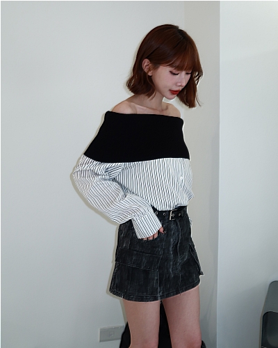 // 甜酷設計感♡不怕掉的一字領!針織配上襯衫布真的太好看!