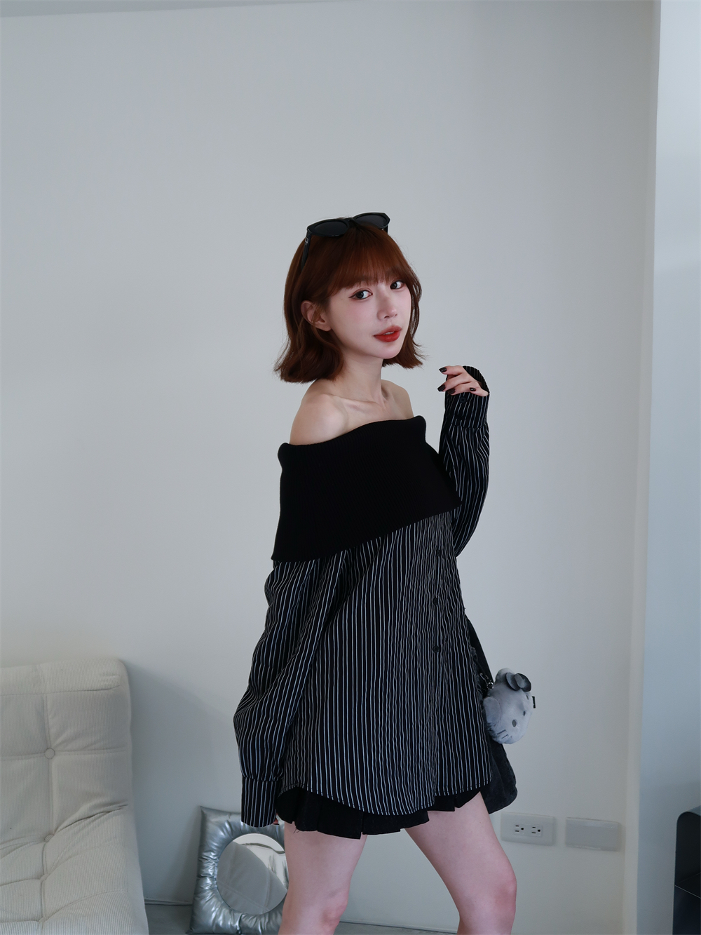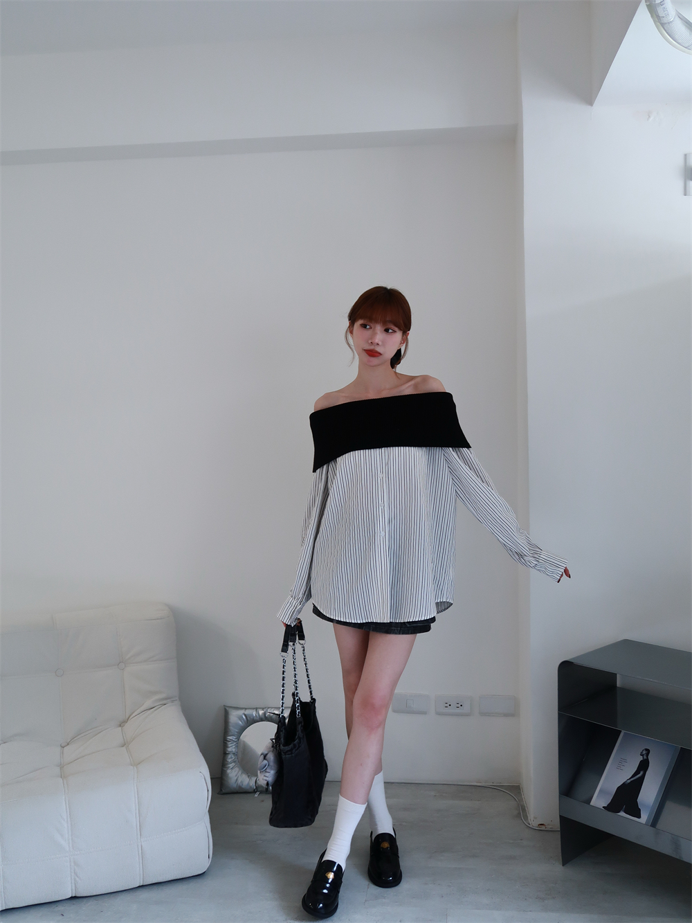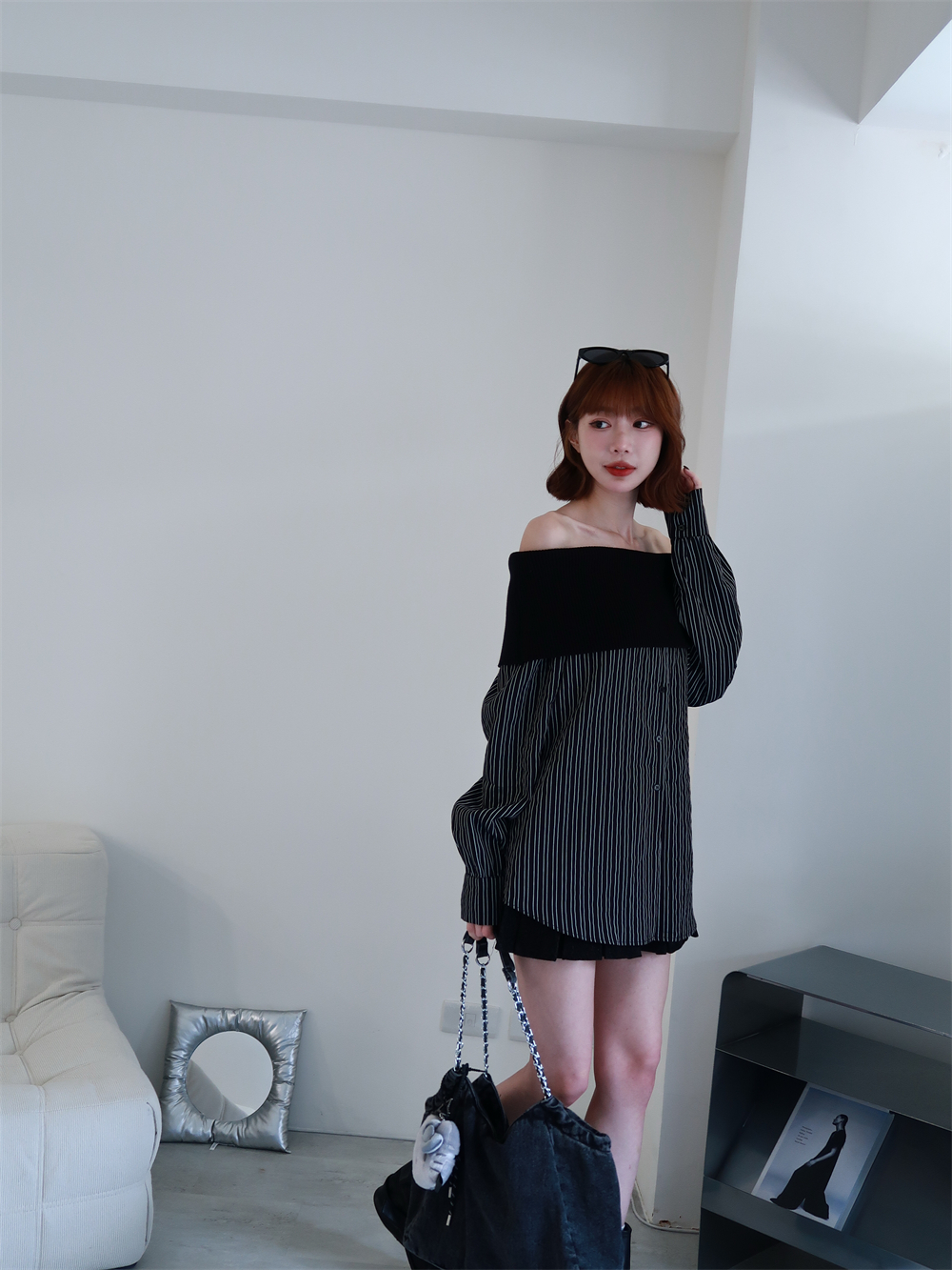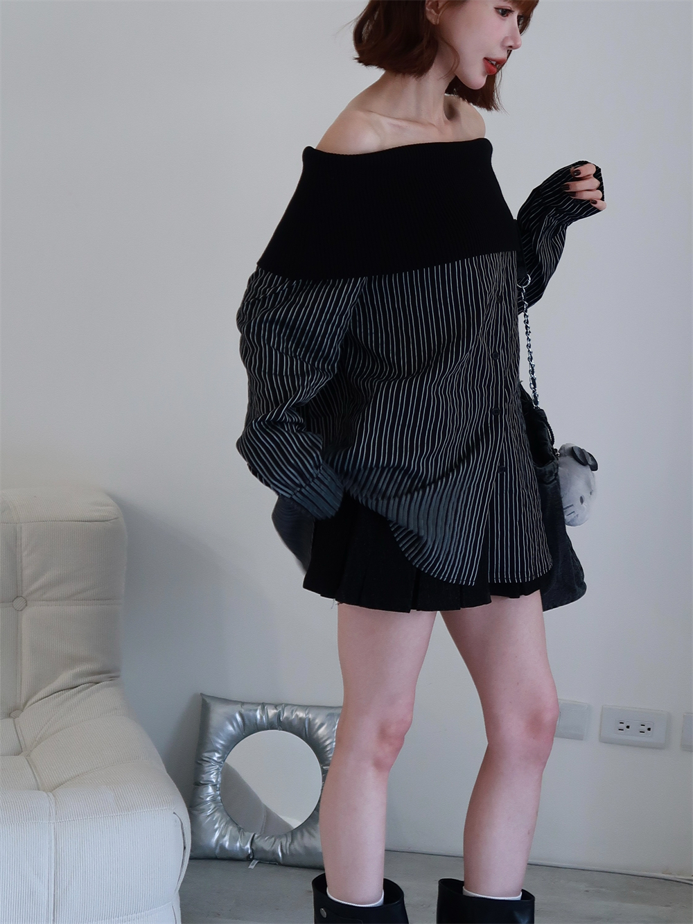 // 甜酷設計感♡不怕掉的一字領!針織配上襯衫布真的太好看!