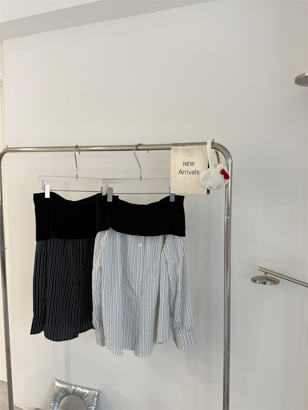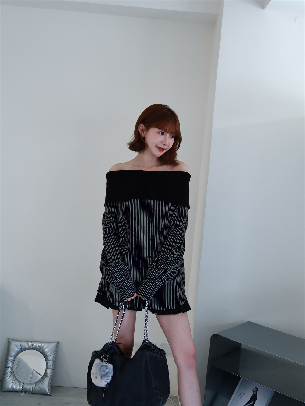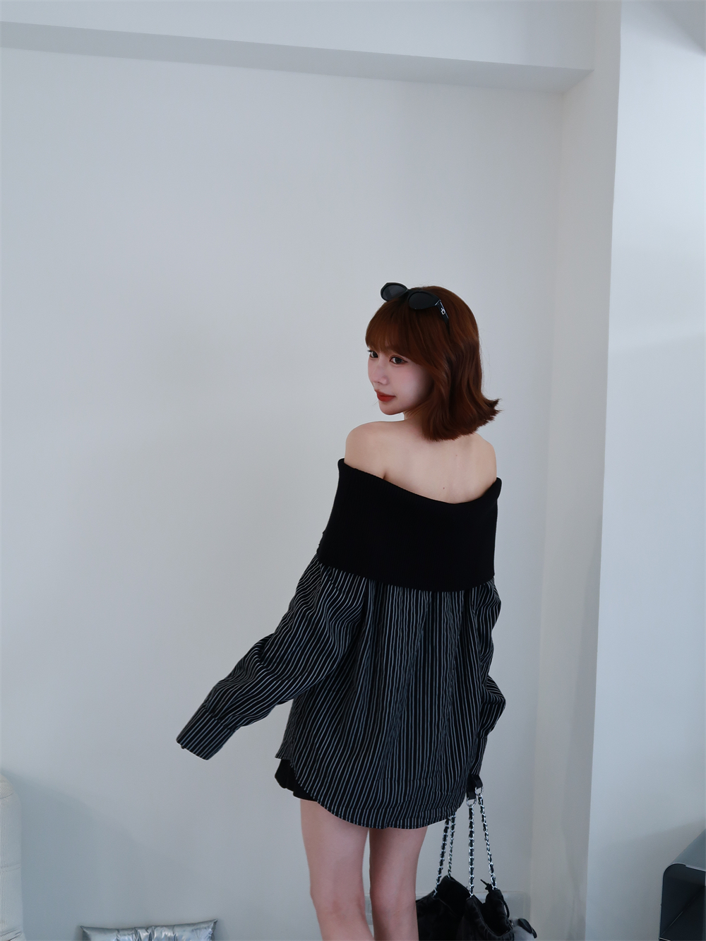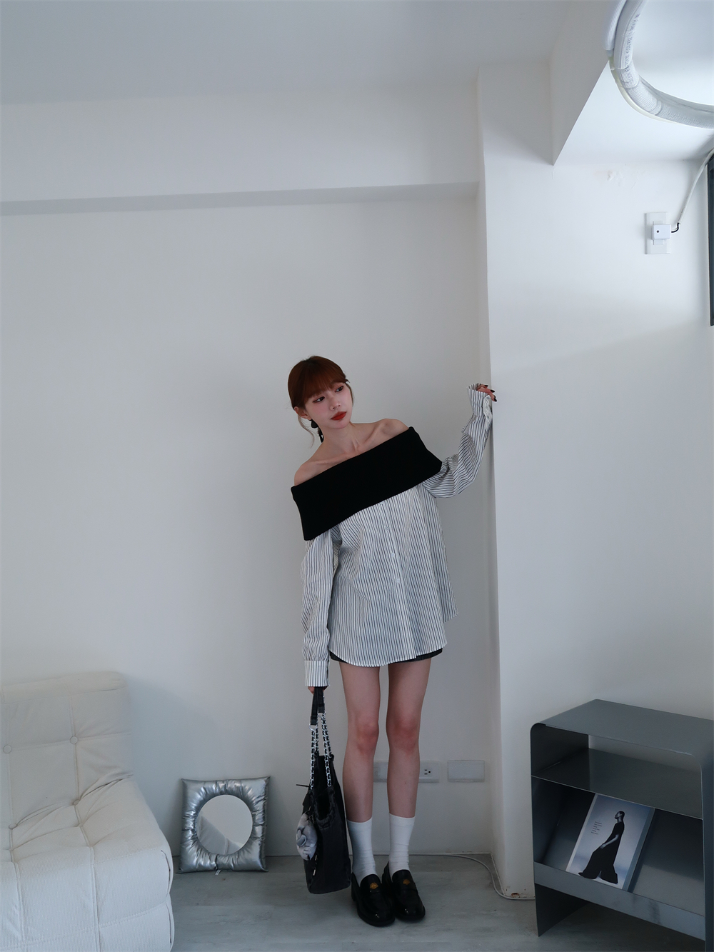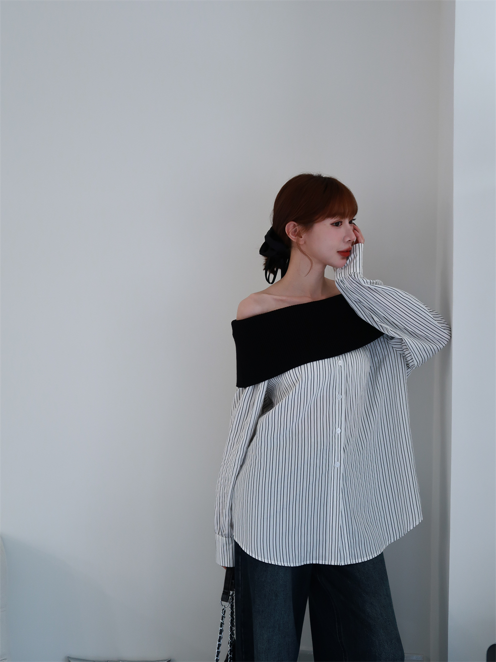 // 甜酷設計感♡不怕掉的一字領!針織配上襯衫布真的太好看!